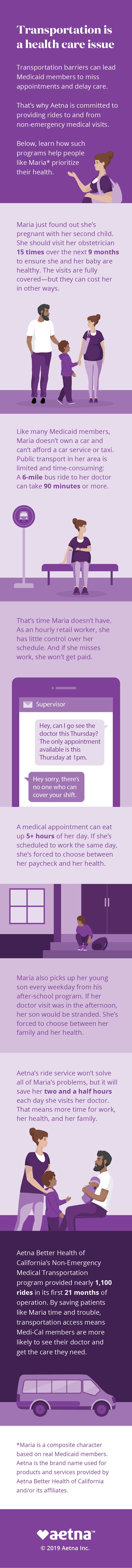 To address the transportation barriers faced by people like Maria, Aetna Better Health provides its members with door-to-door, non-emergency transportation to and from their doctor. At first glance it might seem like a simple benefit to make patients’ lives easier. But Aetna knows it’s a powerful tool that allows people on Medicaid to get the right care at the right time and stay healthy.